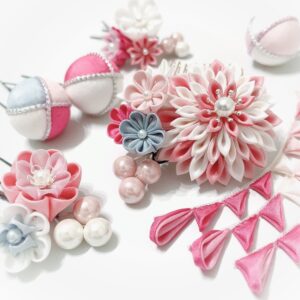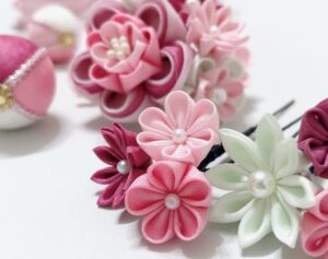 着物の色柄に合わせた色柄の柔らかい髪飾りだったり